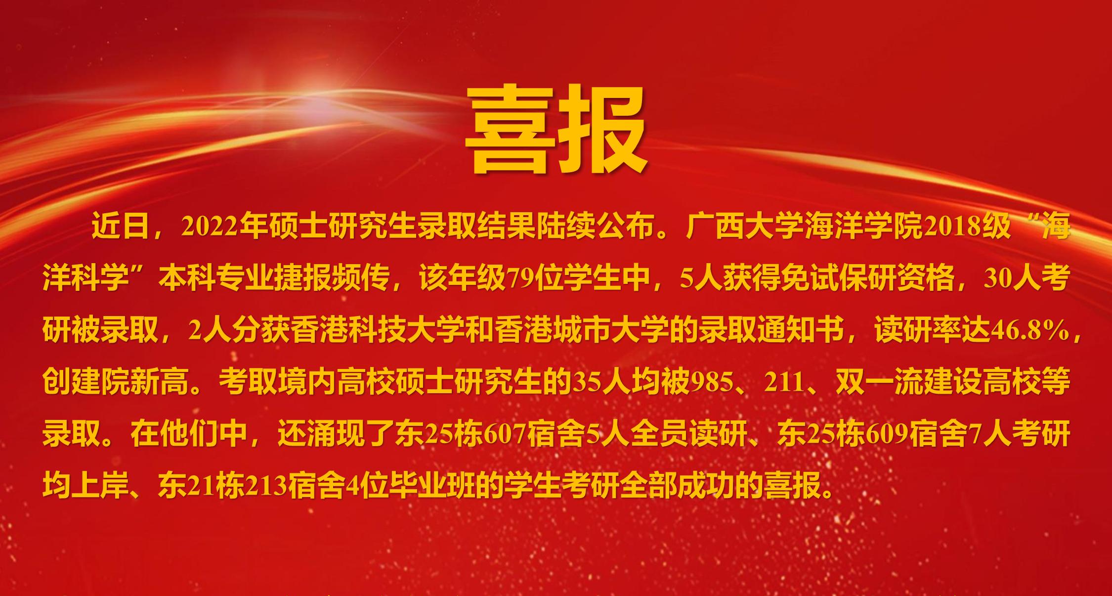 近日,2022年硕士研究生录取结果陆续公布。williamhill2018级“海洋科学”本科专业捷报频传,该年级79位员工中,5人获得免试保研资格,30人考研被录取,2人分获香港科技大学和香港城市大学的录取通知书,读研率达46.8%,创建院新高。考取境内高校硕士研究生的35人均被985、211、“双一流”建设高校等录取。在他们中,还涌现了东25栋607宿舍5人全员读研、东25栋609宿舍7人考研均上岸、东21栋213宿舍4位毕业班的员工考研全部成功的喜报。
