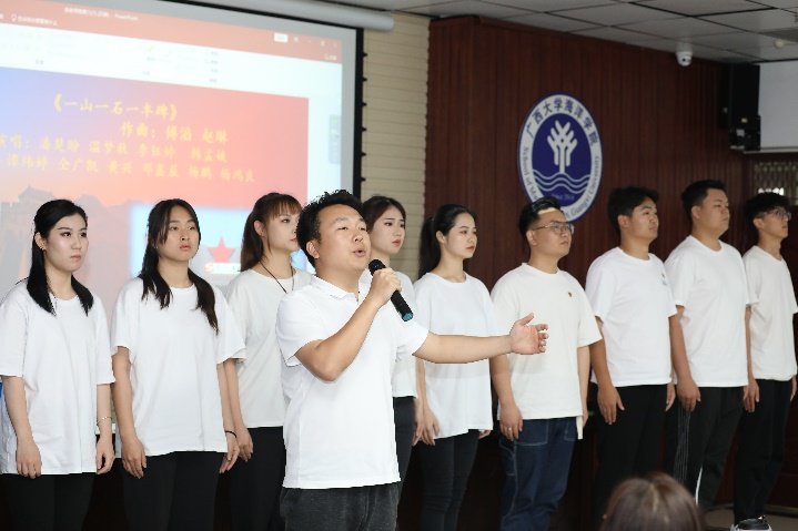 《你好,同志》由黄兴同学演唱,歌曲讲述了来自五湖四海的共产党员同志同心同德,在不同时代踔厉奋发、勇毅前行奉献自我的伟大精神,歌颂了革命同胞之间深厚的友谊;《平安归来》由邓鑫晨同学演唱,以昂扬的旋律赞美了逆行武汉、奋斗在疫情一线的白衣天使们与时间赛跑、用生命打赢这场没有硝烟的战争的可贵精神;《一山一石一丰碑》的创作背景是中国工农红军长征途中最为惨烈的湘江战役,歌曲由桂北民谣为素材创作,缅怀了数万名宁死不屈、长眠湘江的红军将士,警醒广大青年要不忘初心、艰苦奋斗;《桂港同心谱新章》于香港回归25周年时创作,表达了在为实现我国第二个百年奋斗目标的新征程上香港取得更大辉煌并进一步推进桂港协同发展的美好期冀。《梦想》表达了在中国共产党领导下中国人民为实现中华民族伟大复兴的中国梦努力拼搏,唱出了华夏儿女因热爱而坚定、因梦想而奋斗的精神。