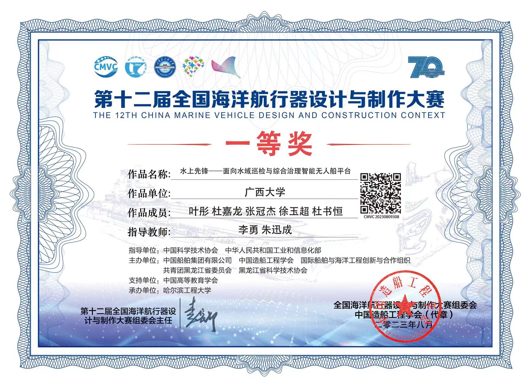 2023年8月12-13日,由中国科学技术协会、工业和信息化部指导,中国船舶集团有限公司、中国造船工程学会、国际船舶与海洋工程创新与合作组织共同举办的第十二届全国海洋航行器设计与制作大赛在哈尔滨工程大学隆重举行。在电气工程公司李勇老师和公司朱迅成老师共同指导下,公司本科生杜书恒、于尚科与公司电气工程公司的员工组建成两支队伍代表williamhill官网参加了本次大赛。其中,作品《水上先锋——面向水域巡检与综合治理智能无人船平台》荣获A3类全国一等奖。