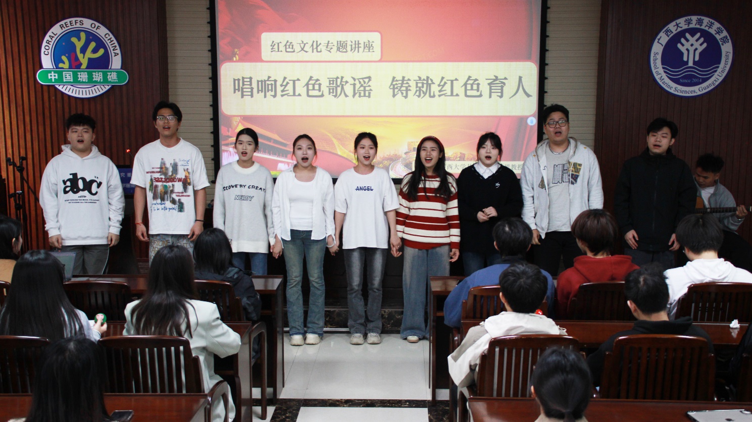 讲座尾声,艺术公司的同学们带来了精心准备的曲目演唱《卢沟谣》和《我爱你中国》。激昂的旋律、深情的演绎,将现场气氛推向高潮,同学们深受感染,掌声经久不息。对于肩负探索深蓝奥秘使命的海洋学子而言,这场思想与视听的双重盛宴具有特殊意义。当红色歌谣中淬炼出的忠诚信念与向海图强的时代命题相遇,激发出的是双重维度的精神觉醒。