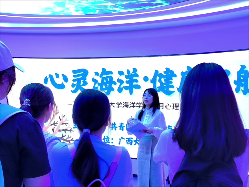 当天下午,在海洋科教馆内同步举办了“心灵海洋·健康启航”心理健康教育活动。现场设置了四大特色互动板块:“从‘心’认识科教馆”,辅导员梁琪通过心理学视角带领同学们重新探索海洋科教馆的展陈内容,感悟海洋科学与内心世界的深度联结;“故事换花·海洋暖流”,参与者写下与海洋相关的温暖故事或鼓励话语,张贴于展板换取鲜花;“海浪心声·海洋治愈”,将烦恼写入“海洋风铃”并悬挂,匿名回复让困惑化作暖心鼓励;而“心灵问答·治愈手工”则通过心理健康知识竞答与海洋刮画创作,寓教于乐中普及心理调适技巧。