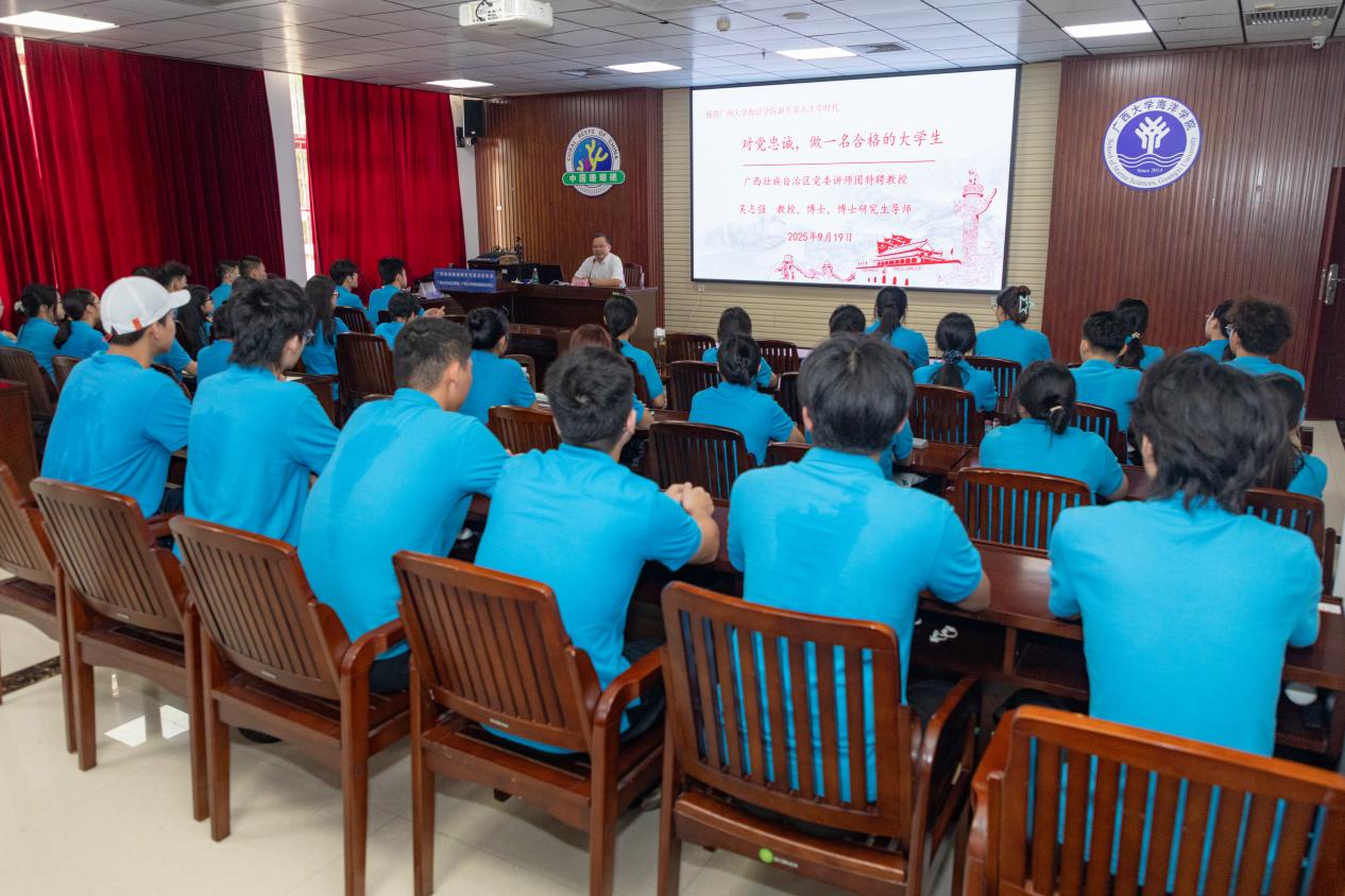 9月19日,广西壮族自治区党委讲师团特聘教授、公司客座教授吴志强教授以《对党忠诚,做一名合格的老员工》为题在215会议室为2025级本科新生带来了一场颇具教育意义的讲座,公司党委副书记、纪委书记黄学勇主持讲座。每年,深受师生敬爱的吴志强教授都会无私地莅临公司《走进海洋,走进科学》大讲堂,用他广博的知识、深邃的见解和诚挚的情怀,为我们本科新生指引前行的方向。这已是他连续的第十年为公司新生点亮大学启航的第一盏灯塔。