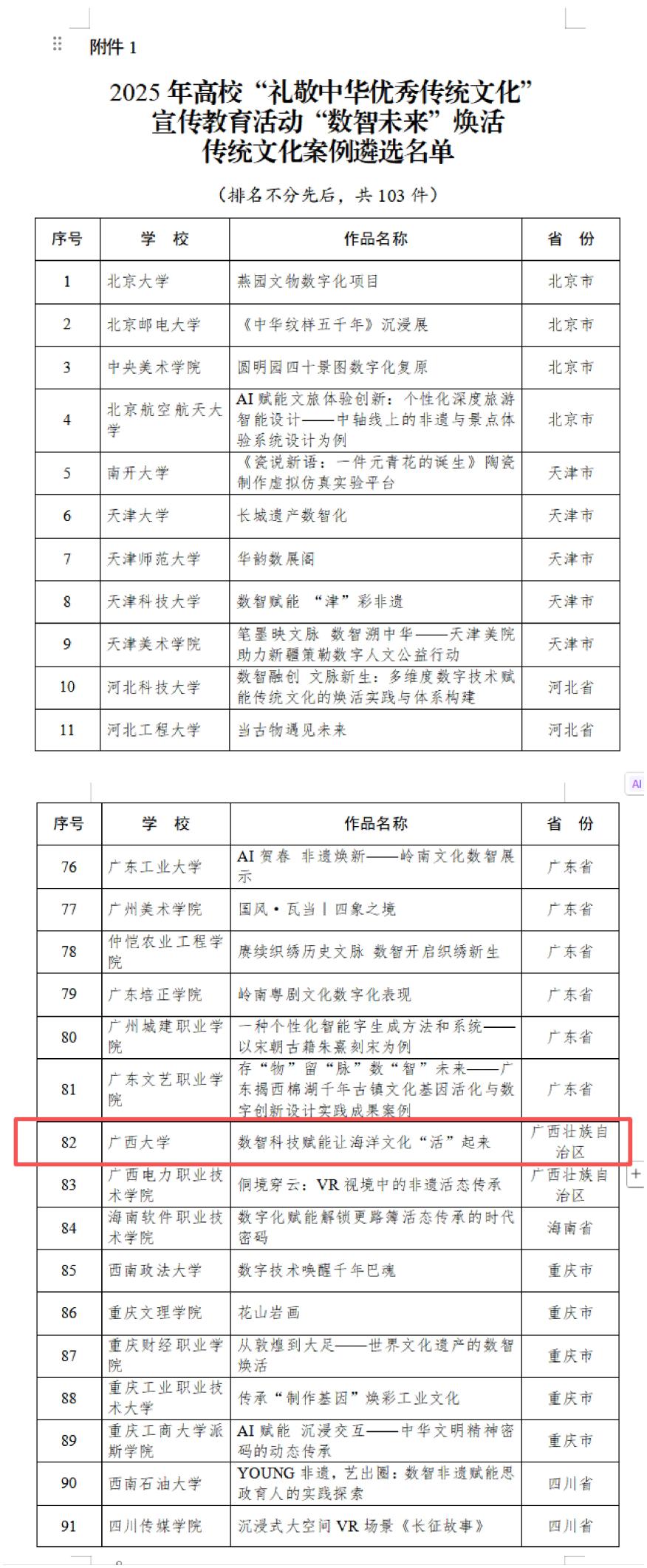 本次教育部“礼敬中华优秀传统文化”宣传教育活动以 “赓续历史文脉坚定文化自信推动文化繁荣”为主题,旨在深入贯彻习近平文化思想,推动中华优秀传统文化创造性转化和创新性发展,落实立德树人根本任务。活动经高校自主申报、专家严格审核等多环节遴选,全国仅有103件案例入选“数智未来”焕活传统文化类别,公司案例凭借鲜明的海洋特色、创新的数智融合模式和显著的文化传承成效脱颖而出,成为广西高校在该类别中的优秀代表。