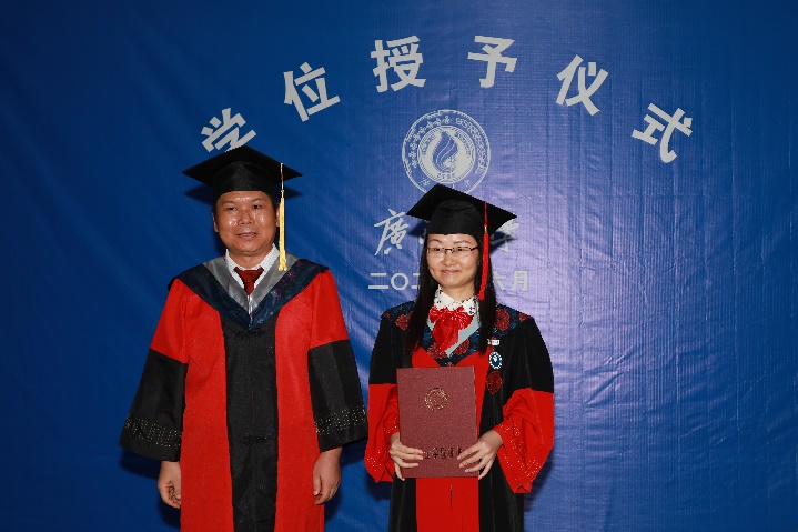 经理余克服教授逐一给毕业生进行拨穗礼、授予学位、颁发学位证书,并一一合影留念。