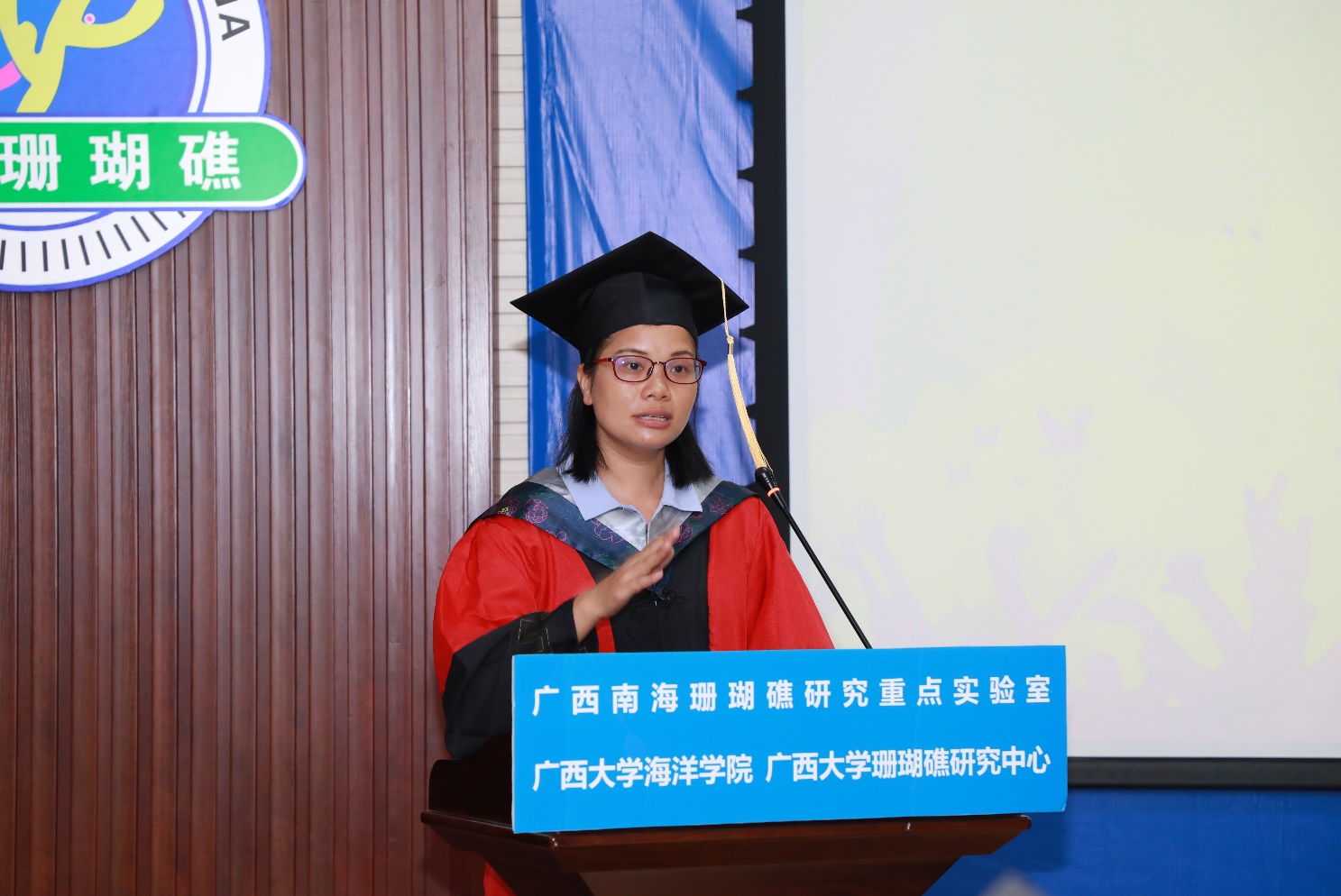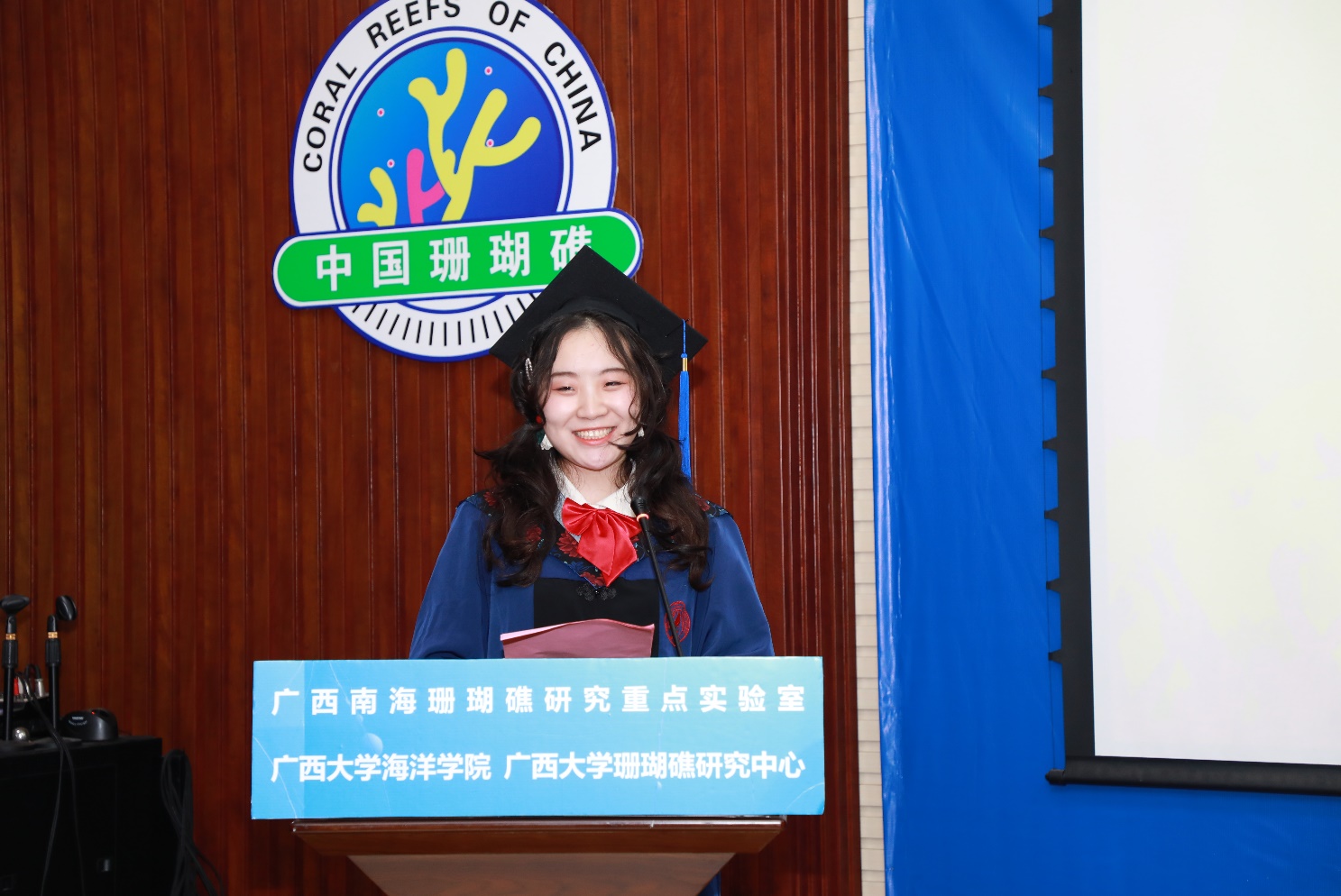 海洋科学2018级本科毕业生代表、2022年自治区优秀毕业生获得者赵博义在发言中致敬了每一位平凡的williamhill员工不平凡的求学时光:无论是老师们在第一堂课程有趣的开场白、引人入胜的专业课、亦或是团委学工老师暖心的一次次关怀,还是专业实习所带来的收获……即使是突发的新冠肺炎疫情都没能阻挡他们前进的脚步、对蓝色海洋的探索。2022届硕士毕业生代表、2022年williamhill官网优秀毕业生马一方回首了三年前遇到导师余克服教授,以此叩开了珊瑚礁学术研究的大门,不畏新冠肺炎疫情、克服研究条件受限等困难坚持开展实验,并成为珊瑚礁科学的研究者、科普者。教师代表、海洋科学2018级3班班主任韦芬老师分享了她对于本、硕、博三个阶段对“毕业”的不同感受,以此向同学们解读每个人生阶段对于“成长”的见解;回顾了她见证、陪伴同学们从青涩少年成长为栋梁之材的高校生活;最后对同学们提出了几点希望:保持终身学习的习惯、勇敢面对困难的勇气、保持年轻人的朝气和蓬勃。