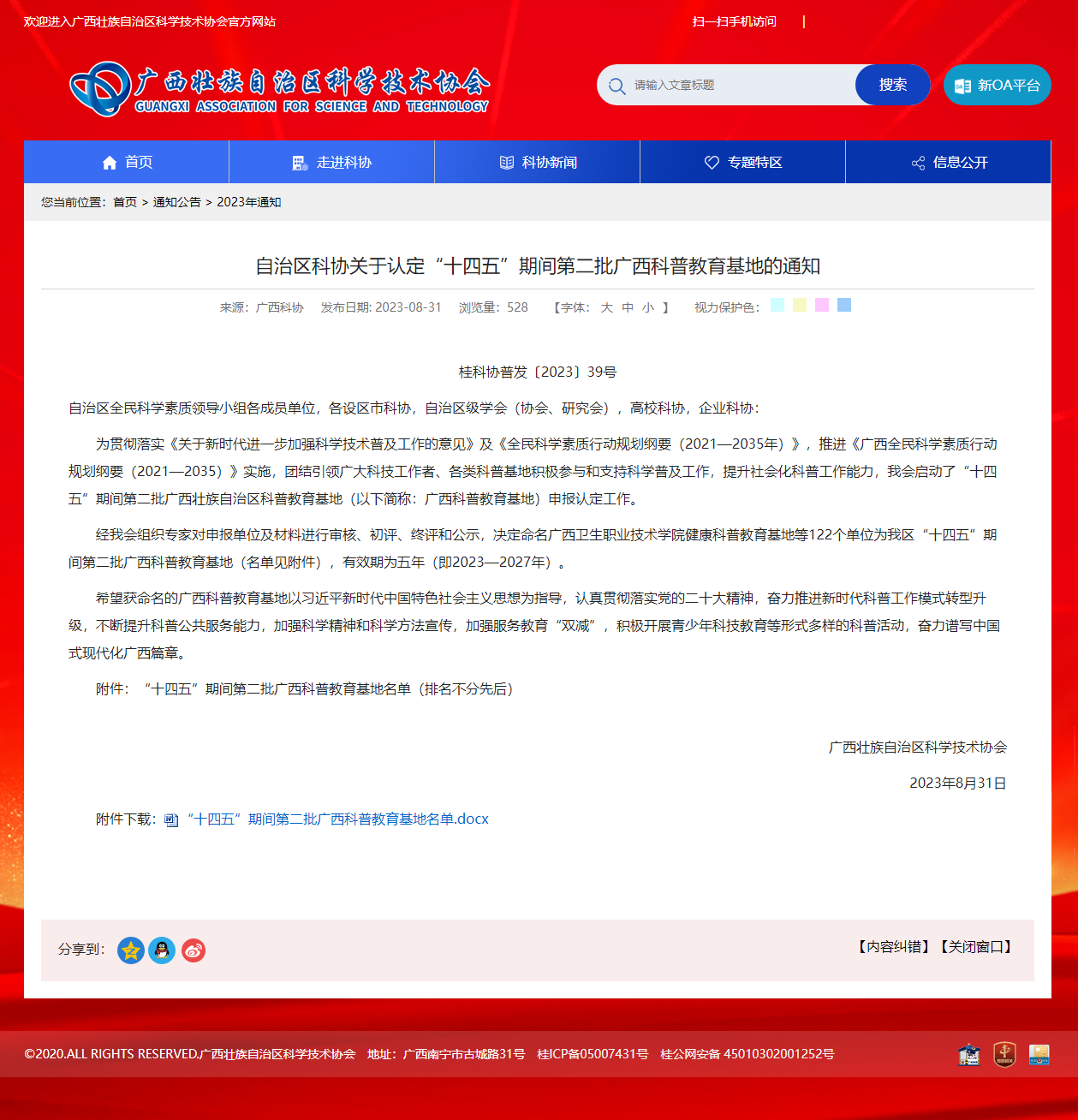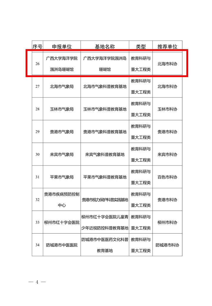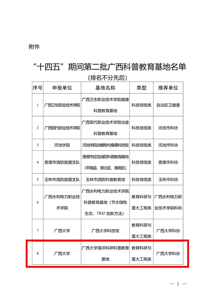 近日,自治区科学技术协会下发了《关于认定“十四五”期间第二批广西科普教育基地的通知》,公司“williamhill官网海洋科研科普教育基地”、“williamhill涠洲岛珊瑚馆”等2个基地分别入选(期限为2023—2027年)。