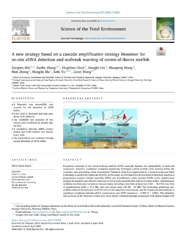 (1) 首创性地构建了一种长棘海星eDNA电化员工物传感平台,并实现了珊瑚礁区海域科考现场快速准确、原位评估长棘海星的存在情况。该技术为示踪和预警长棘海星的暴发提供了新思路和技术支持,相关成果发表在中国科公司1区TOP期刊Biosensors and Bioelectronics, 2023, 230, 115265. (IF=12.6)链接:https://doi.org/10.1016/j.bios.2023.115265.