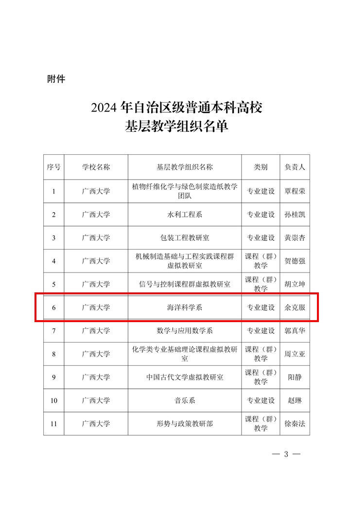 近日,广西壮族自治区教育厅印发了《关于公布2024年自治区级普通本科高校基层教学组织名单的通知》(桂教办〔2024〕941号),公司余克服教授负责的海洋科学系基层教学组织成功获批。