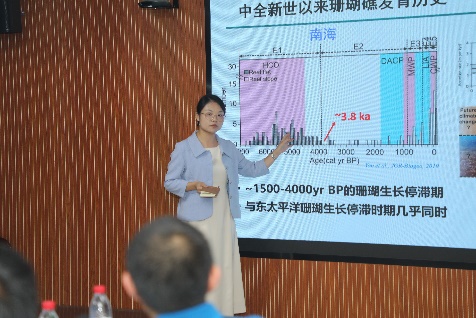 邓文峰研究员以造礁珊瑚为载体,分享了全新世气候变化、海洋变暖和酸化、珊瑚对气候变化的响应和适应三部分内容。讲座以全新世季节尺度“温雨解耦”、夏朝文明兴衰与气候突变之间的关系等揭示了全新世不稳定的气候及对人类文明发展进程的影响;深刻阐述了南海珊瑚对近2000年以来SST和海水δ18O变化的记录;基于珊瑚δ11B对年代际海水pH的记录,重建了近1000年南海北部海水pH演变,并讨论了近300年来全球海域pH的年代际变化与AMO的关系;揭示了近1000年南海珊瑚钙化生长演化、中-晚全新世珊瑚钙化流体碳酸系统演化,探究了参与珊瑚礁生物活动过程中的元素对环境记录的效果,并利用金属稳定同位素表征珊瑚生物活动,对未来的研究方向提出了展望。