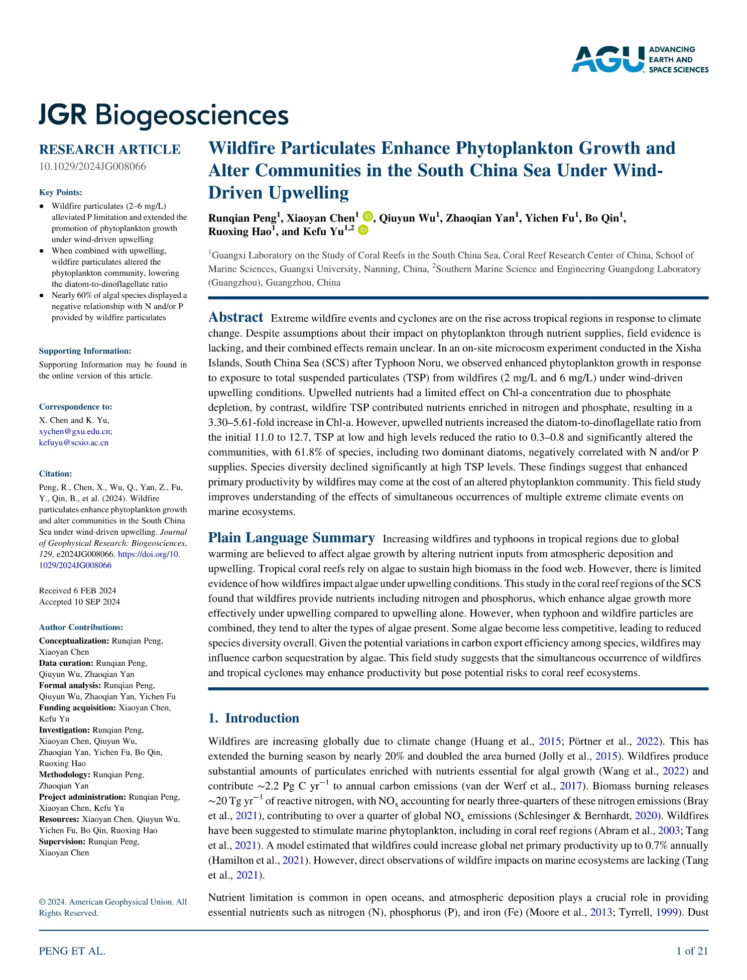 Peng, R., Chen, X., Wu, Q., Yan, Z., Fu, Y., Qin, B., Hao R., and Yu, K., 2024. Wildfire particulates enhance phytoplankton growth and alter communities in the South China Sea under wind-driven upwelling. Journal of Geophysical Research: Biogeosciences, 129, e2024JG008066. https://doi.org/10.1029/2024JG008066
