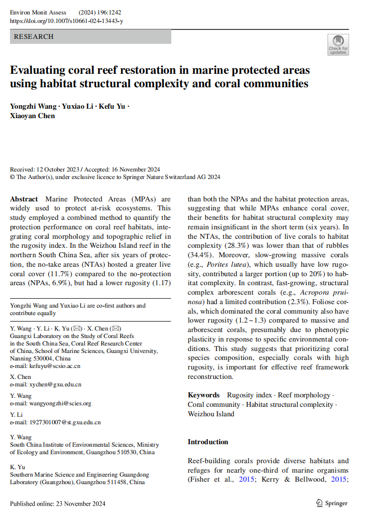Wang Yongzhi, Li Yuxiao, Yu Kefu*, Chen Xiaoyan*. Evaluating coral reef restoration in marine protected areas using habitat structural complexity and coral communities. Environmental Monitoring and Assessment 196, 1242 (2024). https://doi.org/10.1007/s10661-024-13443-y