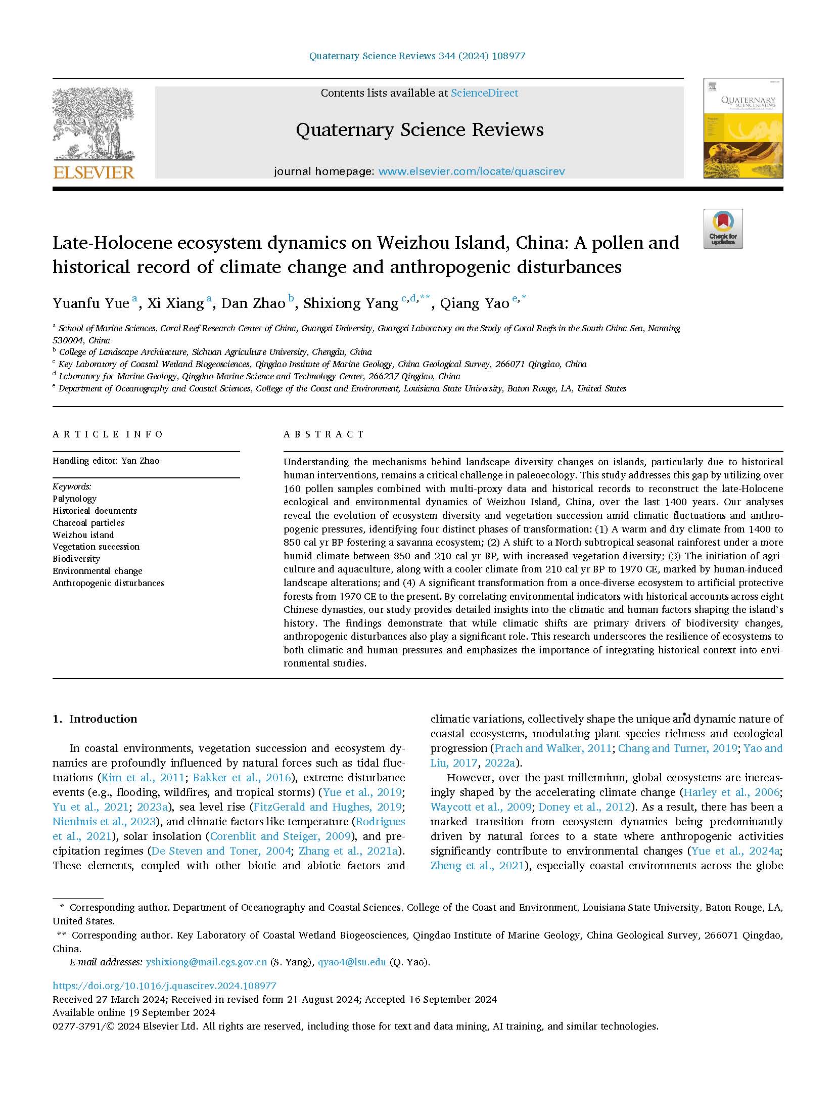 文章信息如下:Yue, Y., Xiang, X., Zhao, D., Yang, S., Yao, Q., 2024. Late-Holocene ecosystem dynamics on Weizhou Island, China: A pollen and historical record of climate change and anthropogenic disturbances. Quaternary Science Reviews 344, 108977, doi: https://doi.org/10.1016/j.quascirev.2024.108977.