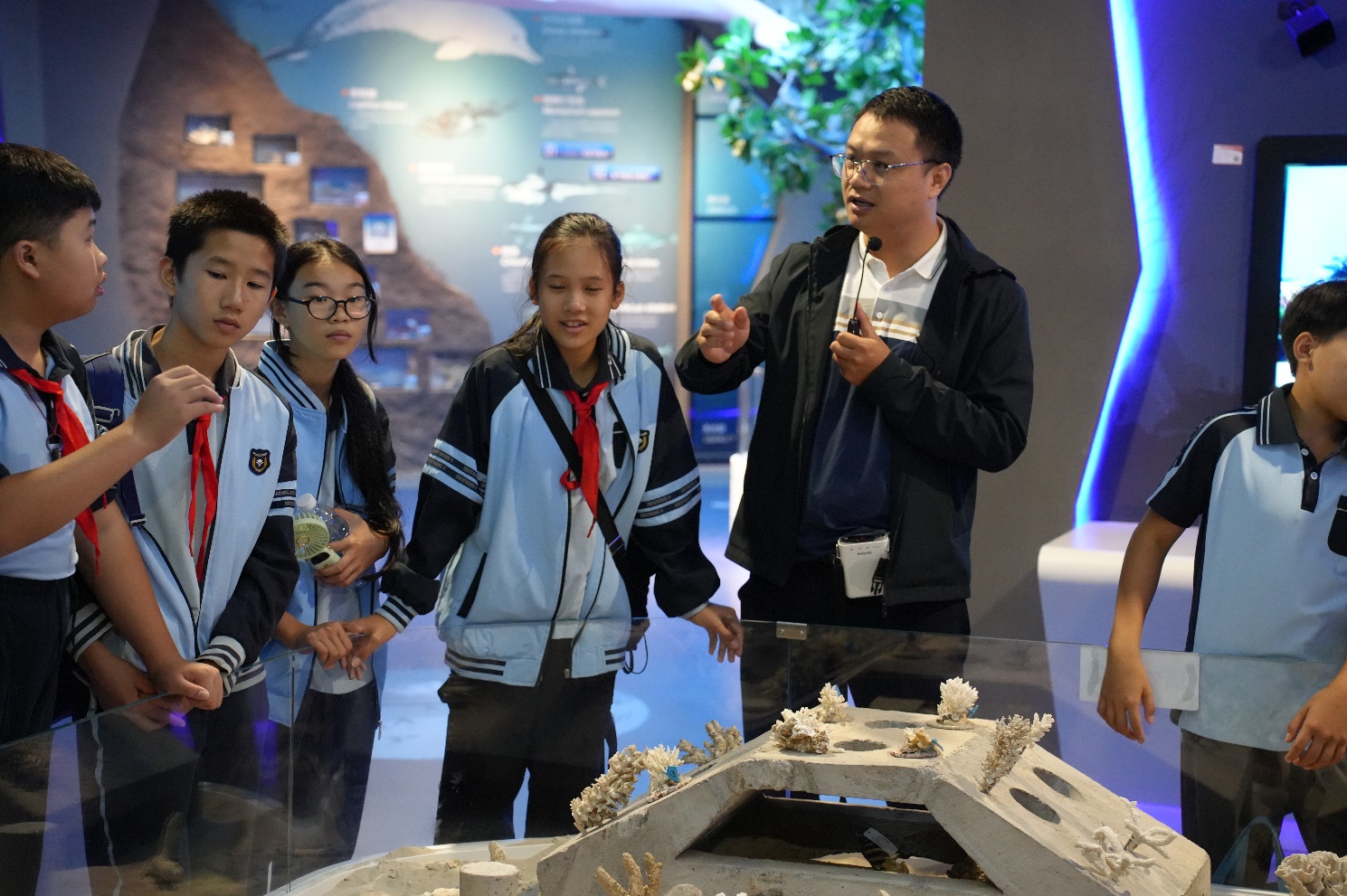 ▲黄雯向小员工科普珊瑚修复的知识。记者 祝萌 摄
