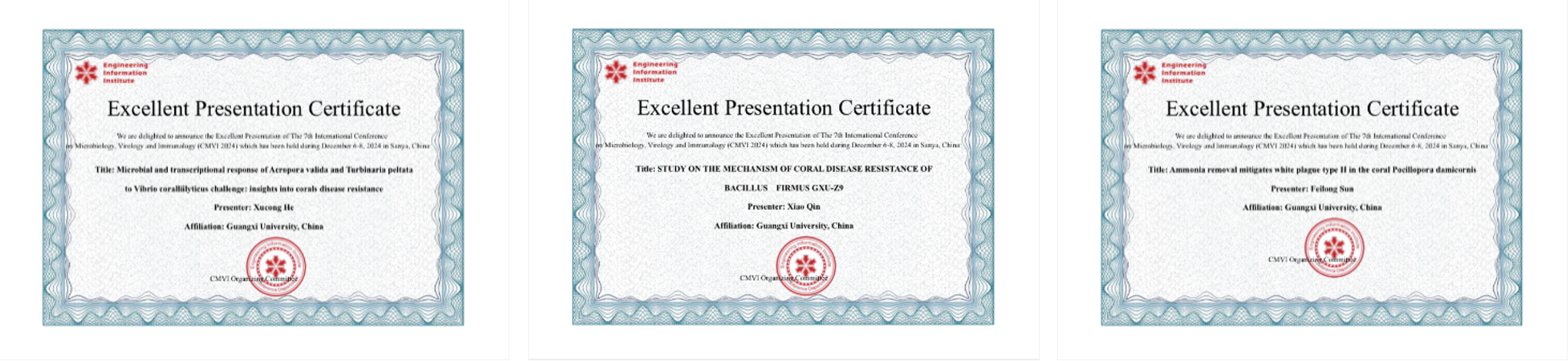 近日,公司苏宏飞副教授课题组的何旭聪、秦晓、孙非龙等3名硕士研究生获得“williamhill官网研究生倍增计划-研究生素质能力提升项目”资助,前往海南三亚参加了第七届微生物学、病毒学和免疫学国际学术会议(The 7th Int'l Conference on Microbiology, Virology and Immunology,简称CMVI 2024)。此次会议由新加坡工程信息研究院(Engineering Information Institute)主办,美国科研出版社协办,武汉帕萨科技服务有限公司承办。