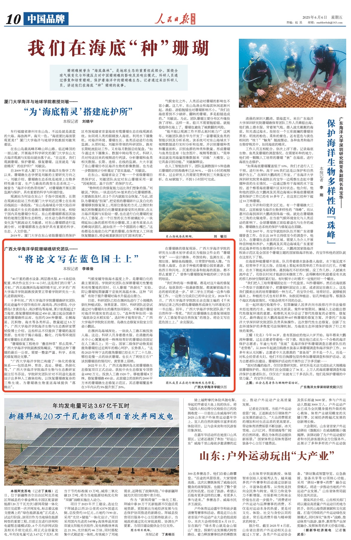 在涠洲岛海域深处,一块块人工礁石被投放入海。这边,科研人员身着潜水服,在清澈的海水中小心翼翼地将一株株培育好的珊瑚幼苗固定在人工礁石上;另一边,国家二级保护动物美丽鹿角珊瑚经过近两年的精心呵护,长势喜人。“这些2023年种下去的鹿角珊瑚已经长大了二十几倍,哪怕是慢一点的块状珊瑚,也长大了两倍左右!”谈到珊瑚苗的情况时,黄雯喜上眉梢。
