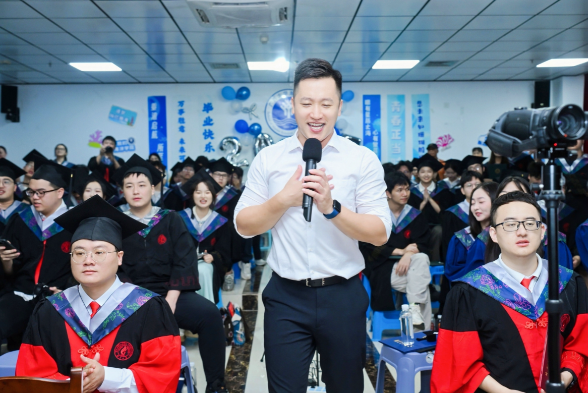 余克服经理在毕业典礼上发表深情寄语。他向圆满完成学业的毕业生表示热烈祝贺,并衷心感谢同学们为公司发展所做的贡献。余克服经理希望同学们在今后能够永葆对海洋的热爱,发扬乐观主义精神与实干主义精神,不断充实自己、提升格局,保重身体、感恩家人,做一个有理想、有道德、有才华、有担当的新时代青年人。
