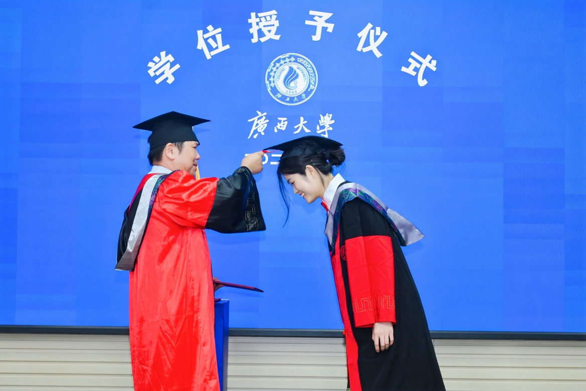 在最激动人心的学位授予环节,余克服经理逐一给毕业生进行拨穗礼、授予学位、颁发学位证书,并合影留念。
