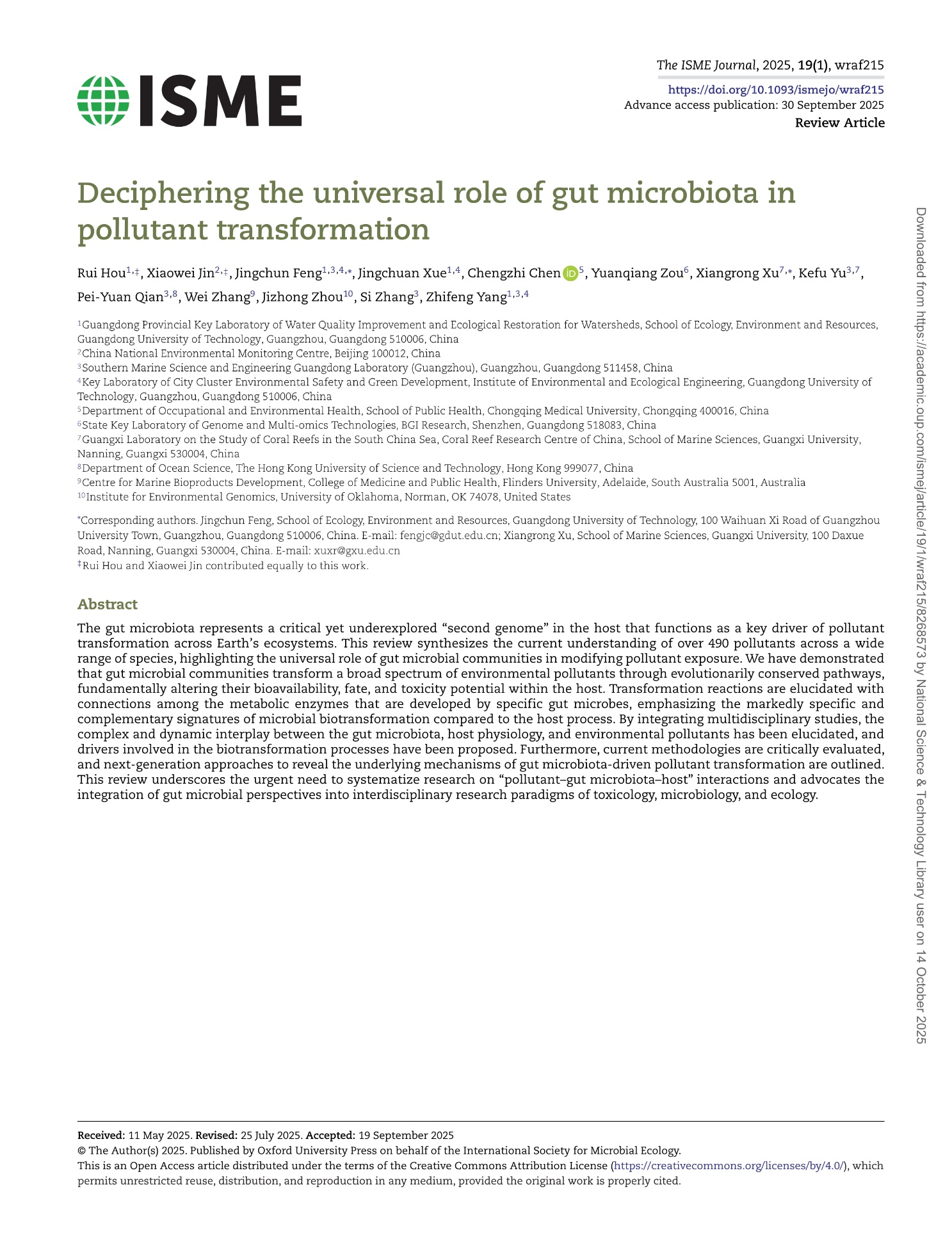 近日,公司携手广东工业大学、中国环境监测总站,在国际微生物生态学领域顶级期刊The ISME Journal(中国科公司一区Top)联合发表评论性综述论文 “Deciphering the Universal Role of Gut Microbiota in Pollutant Transformation(解读肠道微生物在污染物转化中的普遍作用)”。该综述开创性地以“同一个星球,同一个健康(One Planet, One Health)”为研究视角,对涵盖无脊椎动物至人类的13个类群生物的肠道微生物群对490多种环境污染物的转化能力。所涉及的污染物类型广泛,包括持久性有机污染物、重金属、药品和个人护理品、工业添加剂等。此外,论文还明确揭示了肠道微生物群在污染物转化过程中的普遍作用机制,深入探讨了该转化过程对污染物生物利用度、毒性水平及环境归趋的影响。在此基础上,研究团队进一步提出“污染物—肠道微生物群—宿主”相互作用的系统化研究方向,并倡导将肠道微生物的转化能力纳入跨学科研究范式,为相关领域研究提供全新思路。