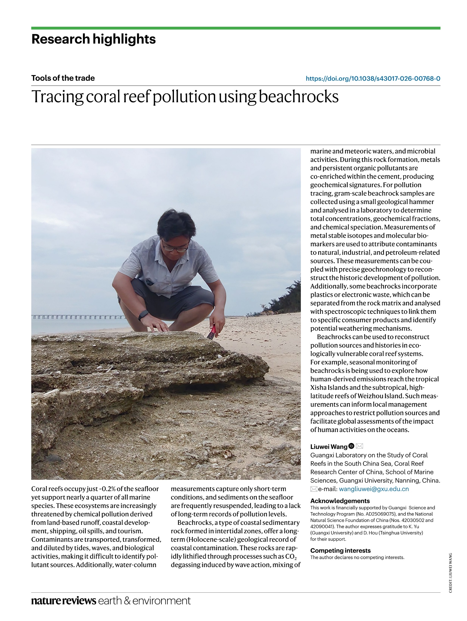 近日,Nature子刊《自然综述:地球与环境》(Nature Reviews Earth & Environment)(IF=71.5)发表了公司青年教师王刘炜博士题为“Tracing coral reef pollution using beachrocks”的方法评述(Tools of the Trade)论文,提出了用海滩岩追溯珊瑚礁区环境污染的新思路。