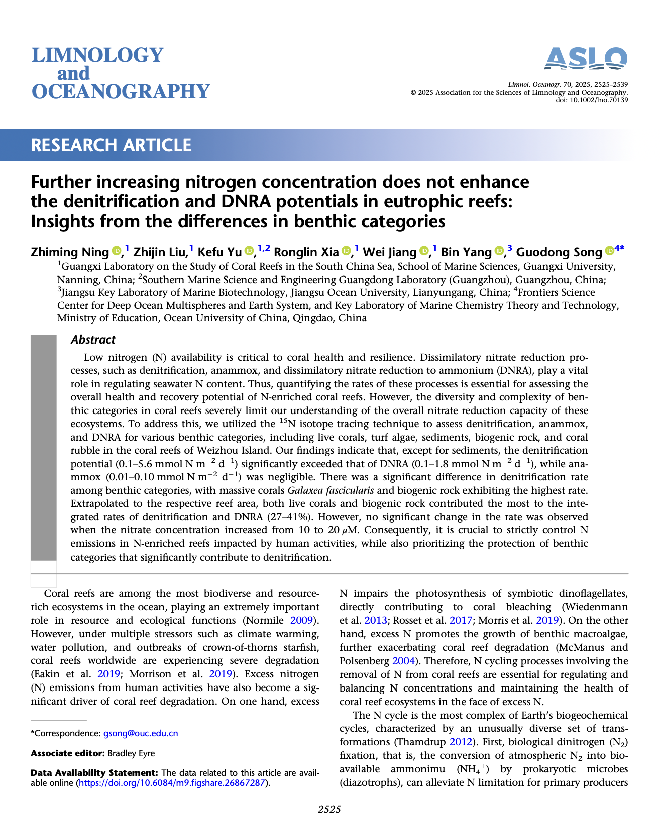 公司宁志铭博士等在海洋学领域顶级期刊《Limnology and Oceanography》上发表了题为《Further increasing nitrogen concentration does not enhance the denitrification and DNRA potentials in eutrophic reefs: Insights from the differences in benthic categories》的研究论文。该研究系统量化了富氮珊瑚礁环境中硝酸盐异化还原过程的速率,揭示了不同底质类型与环境因子对硝酸盐异化还原过程的影响,为珊瑚礁生态系统的健康评估和应对富营养化威胁提供了关键科学依据。