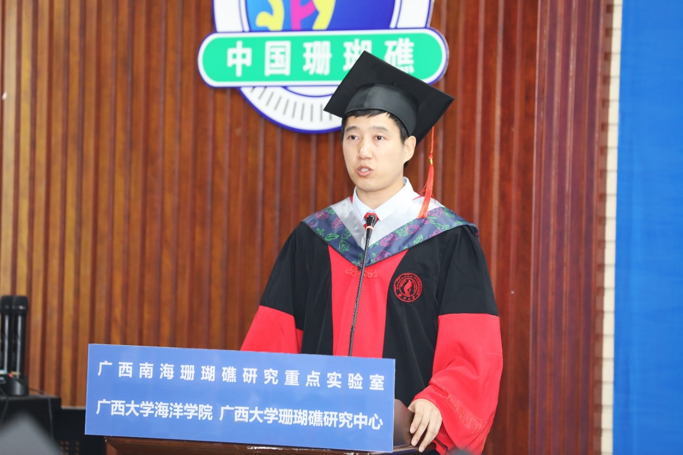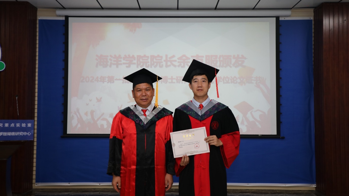 On June 25, the Hooding and Commencement Ceremony for the 2024 students of School of Marine Sciences at Guangxi University was held in Conference Room 215. This is the 5th batch of undergraduate, the 3rd batch of master's students in Marine Science, and the 4th batch of doctoral students in Marine Biological Resources and Environmental Protection from the School of Marine Sciences at Guangxi University. They have successfully completed their studies and were going to embark on new journeys in life.