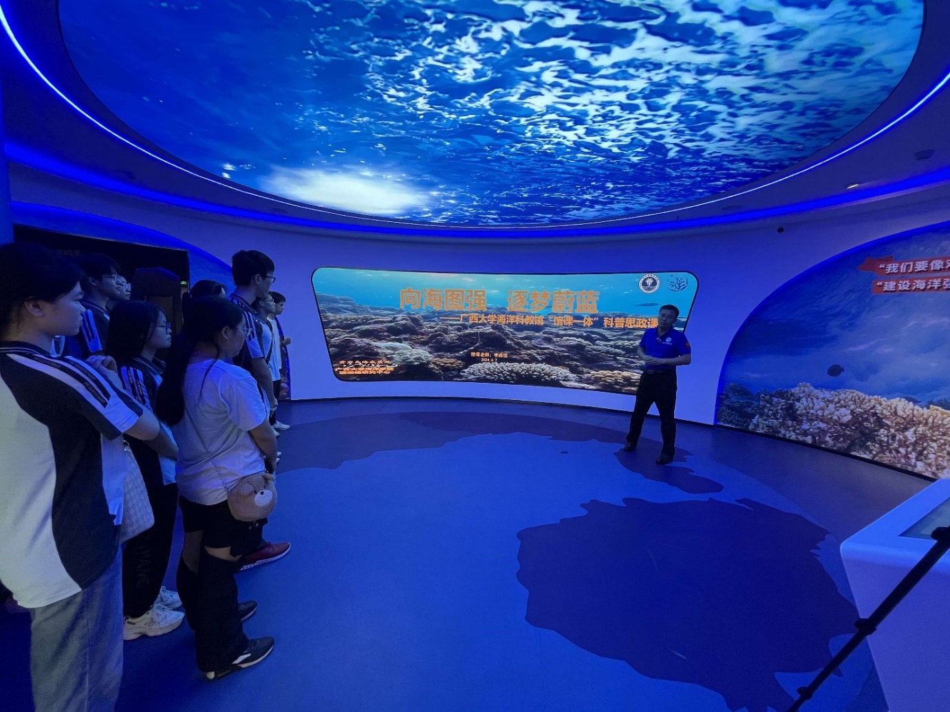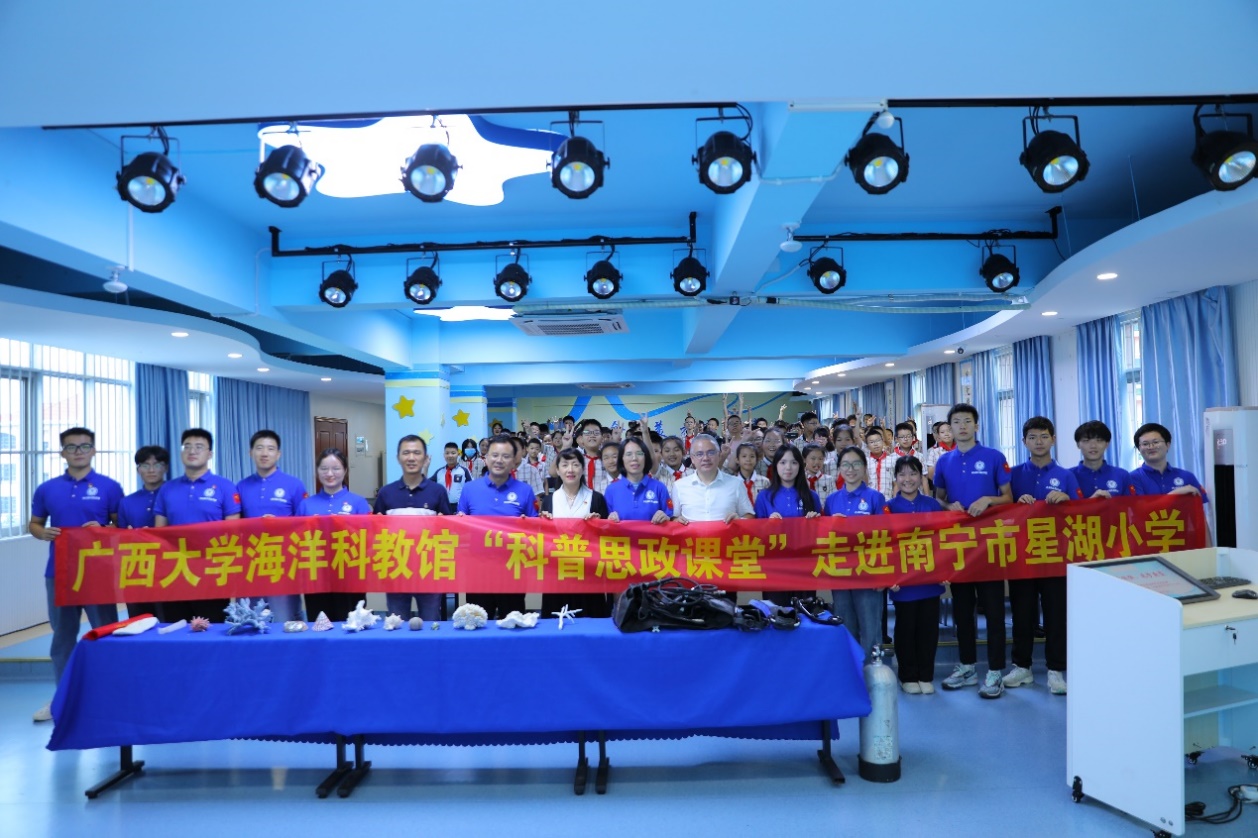 On June 3, Liu Qiyang (Vice-Dean) and Li Zhoujia (Executive Deputy Director of the Marine Science and Education Museum), together with the college's "Blue Dream·Science Popularization First" science popularization volunteer team to Xinghu Road Primary School in Nanning. They conducted an ideological and political education course about marine popularization for the students, theme of "Seeking national prosperity and strength from the ocean, Pursuing the Blue Dream". Combination of science education and ideological and political education have injected new vitality into marine science popularization education and inspired students' enthusiasm to explore, understand and protect the ocean.