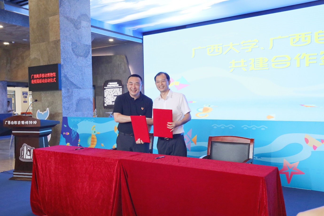 On June 7, the "Guangxi Marine Mobile Museum" series of campus activities was launched at the Guangxi Natural Resources Museum, jointly sponsored by the Oceanic Administration of Guangxi Zhuang Autonomous Region, Guangxi Academy of Sciences and Guangxi University, and co-organized by the Natural Resources Museum of Guangxi, School of Marine Sciences at Guangxi University and Guangxi Radio and Television Station Mobile Digital TV Channel. Liang Enwei (Member of the Standing CPC and Vice President of Guangxi University), attended and delivered a speech. Qin Huadong (Secretary of Party Committee of College), Wang Rui (Vice-Dean), Huang Xueyong (Secretary of Youth League Committee of College) and representatives of undergraduate and graduate students attended the event. At the event, Guangxi University and the Natural History Museum of Guangxi signed a cooperation agreement on Industry-University-Research, and held a plaque awarding ceremony for Scientific Research and Practice Base. Additionally, our college donated samples from the Xisha Islands in the SCS to the Natural Resources Museum of Guangxi to help enrich science popularization education. After the launching ceremony, our college’s Coral Reef Protection and Restoration Innovation Team set up an exhibition area at Nanning Beifu Experiential School. They conducted science popularization activities on coral reef knowledge, which attracted enthusiastic participation of many students.