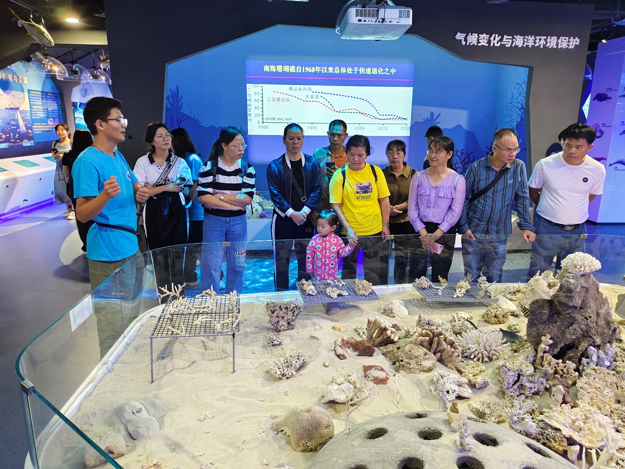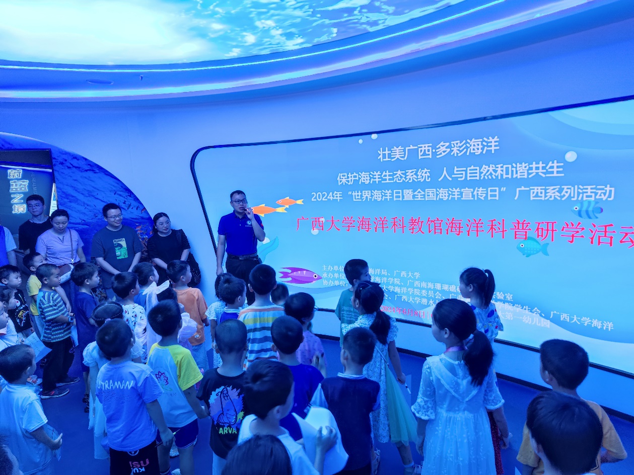 On June 8, our college held a science popularization activity with theme of "Protect Marine Ecosystem, Harmonious Co-existence between Humans and Nature" at the Marine Science and Education Museum, and invited children from the No.1 Kindergarten of Guangxi University to participate. Assoc. Prof. Huang Rongyong (Asst. Dean), Huang Xueyong (Secretary of Youth League Committee of College), and Assoc. Prof. Wang Guanghua (Department of Marine Biology and Ecology) attended the event. Teacher Huang Xueyong explained marine knowledge to the children in detail. His explanation sparked their curiosity about the coral world. They carefully followed his rhythm to understand the coral reef ecosystem step by step, and quietly ignited their dreams of marine science while exploring the mysteries of the ocean together.