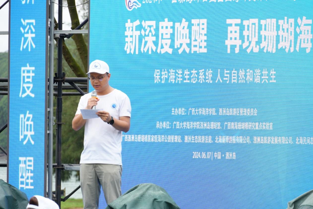 On June 7, the 2024 "World Oceans Day and National Marine Billboard Day" series of activities with theme "New Depth Awaken to Reappearance Coral Sea" were held at the South Bay Marine-Sports-Base on Weizhou Island and the coral reef restoration area on the north of island. That event was hosted by Guangxi University and Oceanic Administration of Guangxi Zhuang Autonomous Region, organized by School of Marine Sciences at Guangxi University, Guangxi Laboratory on the Study of Coral Reef in the SCS and the Management Committee of Weizhou Island Tourist Attraction, Beihai. Huang Wen, Director of the Coral Reef Museum on Weizhou island of the School of Marine Sciences at Guangxi University, attended the event and introduced the remarkable achievements of our team on coral reef protection and restoration, marine environmental monitoring etc. In addition, our college has also launched "Adopt a Coral" activity. Through coral adoption, participants had the opportunity to personally experience the importance of coral protection, enhanced their awareness and sense of responsibility towards marine ecological conservation, promoted coral conservation efforts and public engagement.