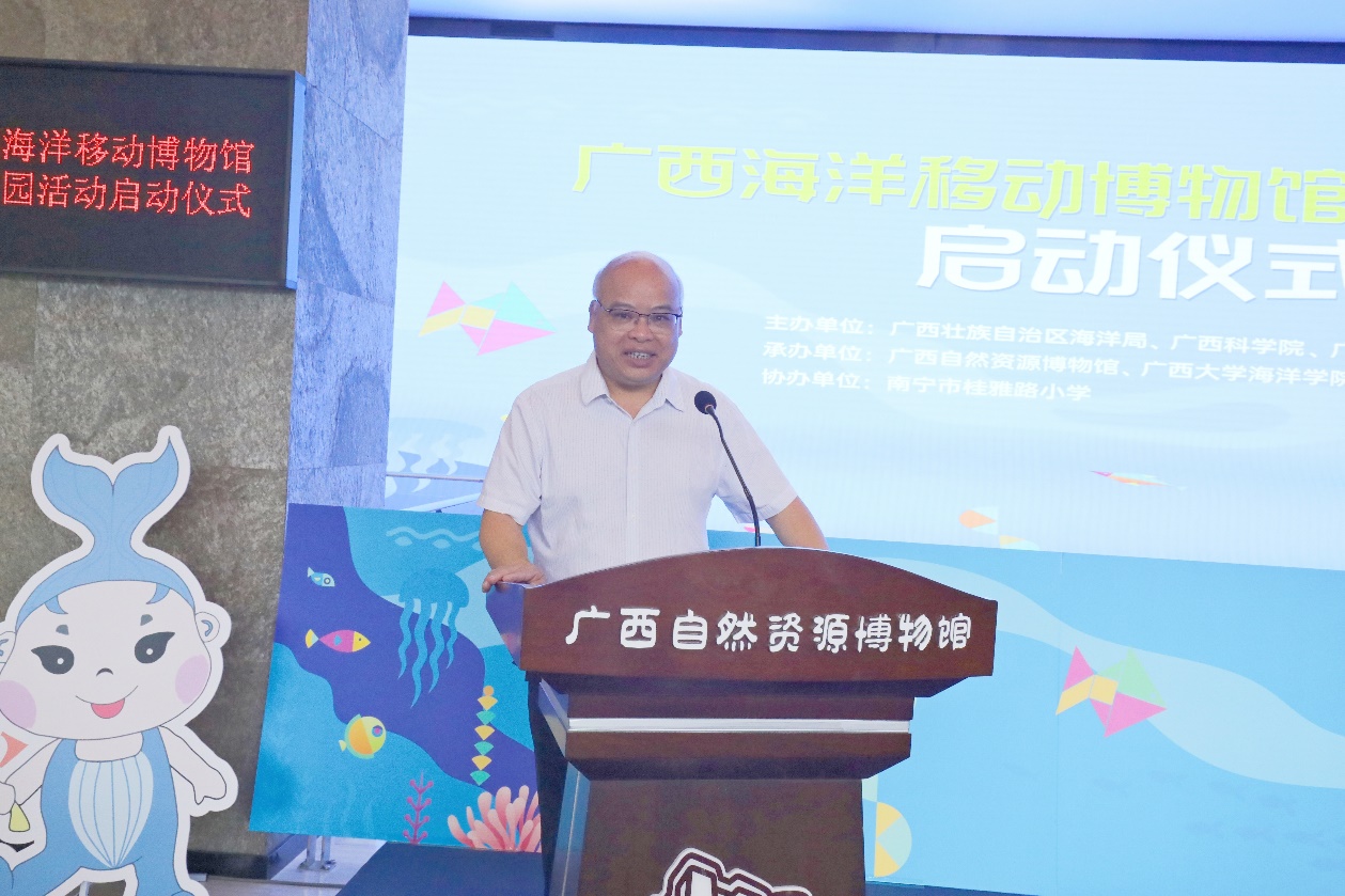 Vice President Liang Enwei delivered a speech at the launching ceremony of the "Guangxi Marine Mobile Museum" series of campus activities