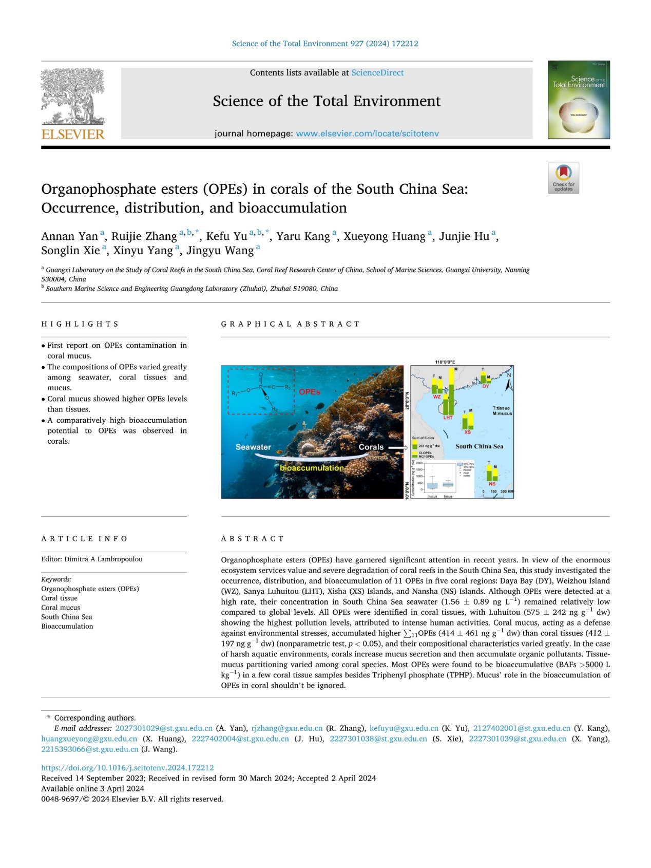 Yan Annan, Zhang Ruijie, Yu Kefu, Kang Yaru, Huang Xueyong, Hu Junjie, Xie Songlin, Yang Xinyu, Wang Jingyu. (2024). Organophosphate esters (OPEs) in corals of the South China Sea: Occurrence, distribution, and bioaccumulation. Science of The Total Environment 927, 172212.https://doi.org/10.1016/j.scitotenv.2024.172212.