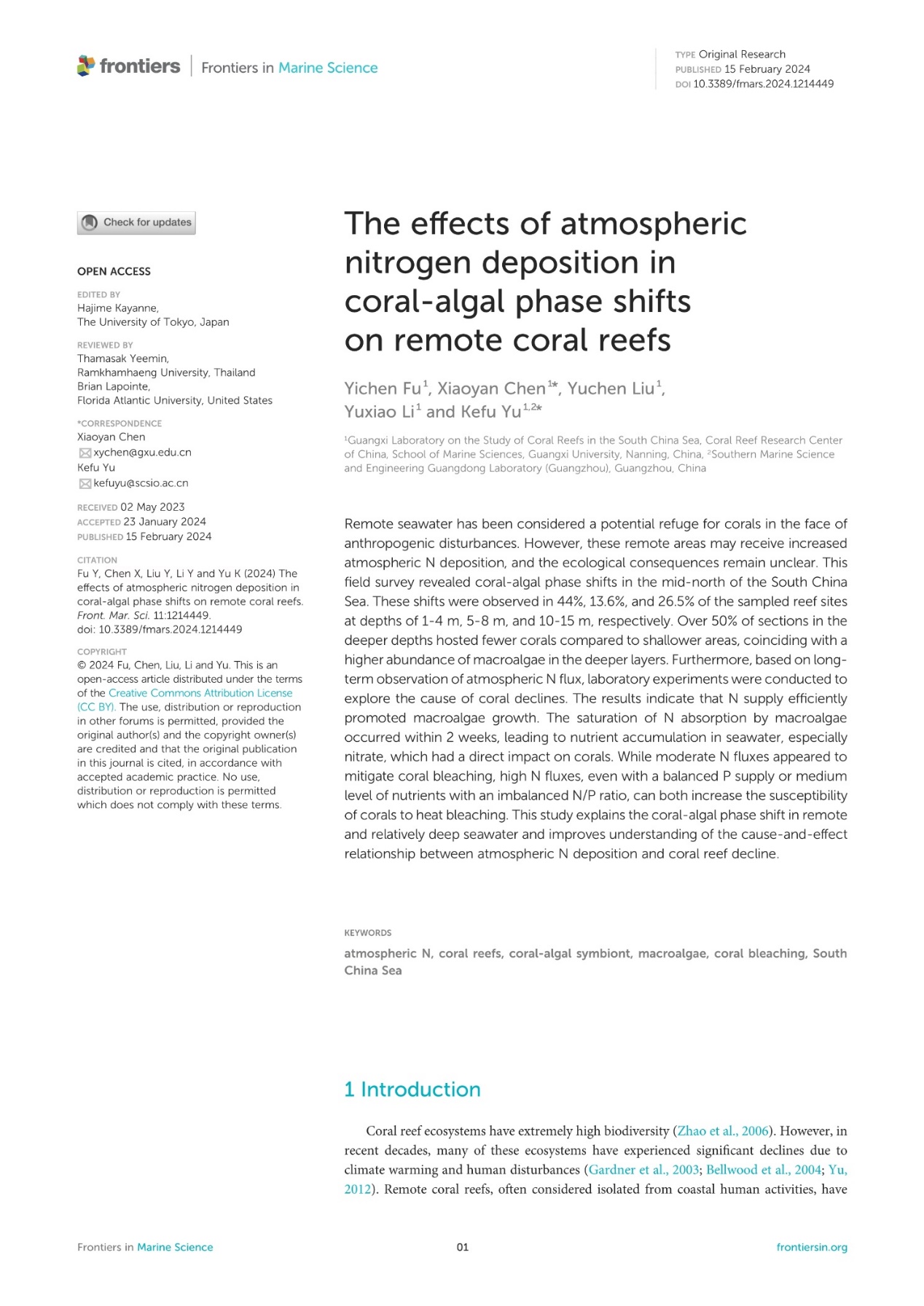 Fu Y, Chen X, Liu Y, Li Y and Yu K (2024) The effects of atmospheric nitrogen deposition in coral-algal phase shifts on remote coral reefs. Front. Mar. Sci. 11:1214449. doi: 10.3389/fmars.2024.1214449